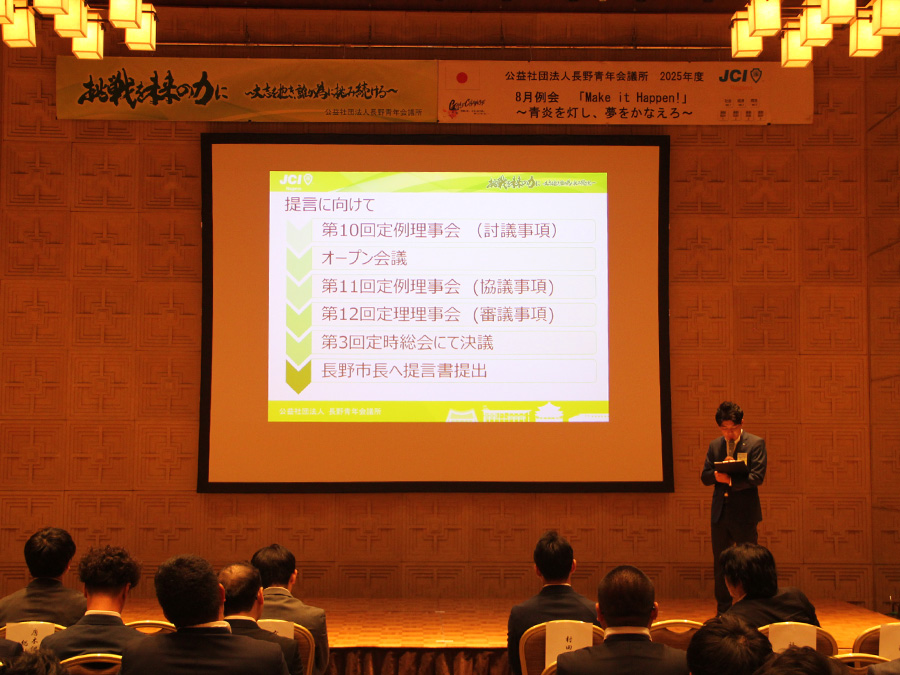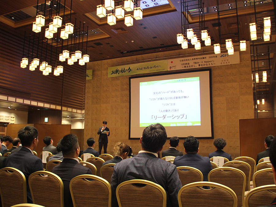 8月例会「Make it Happen!」~青炎を灯し、夢をかなえろ~開催報告 2025.10.15 Tweet Share 8月23日(土)に8月例会「Make it Happen!」~青炎を灯し、夢をかなえろ~開催報告を開催しました! 全会員がこのまちのリーダーとしての行動意欲を向上させることを目的に、未来黎明委員会が行った過去の五輪招致運動の調査研究やこのまちに過去最大のインパクトをもたらした長野五輪を通し、我々ならではの未来に向けたありたい理想の姿を追い求めた調査研究の過程を発表いたしました。壮大な夢と自由な発想を胸に構築いたしました本例会においては、参加メンバーより情報量の多さや内容の充実度などにおいての満足の声を多くいただくことができ、会員の行動意欲の向上ならびに今後まちや組織をより良くするために行う行動のヒントとなり得たのではないかと感じております。今後もまちの新たな変革の起点となるべく、さらなる組織内自己啓発の必要性を感じることができました。ご参観された皆様、ご協力いただきました皆様ありがとうございました。 【開催日】2025年 8月23日(土)17:30~20:00 【会場・開催場所】ホテル国際21 【主催】公益社団法人長野青年会議所(未来黎明委員会) Tweet Share