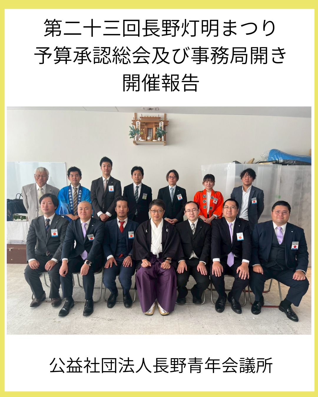 第二十三回 長野灯明まつり予算承認総会、事務局開きの開催報告 2025.10.29 Tweet Share 10月6日(月)10時に、第二十三回長野灯明まつり予算承認総会を開催いたしました。この場をお借りして各関係者の皆様に御礼申し上げます。ここから長野灯明まつり開催当日まで激動の日々が始まりますが、北島事務局長及び事務局メンバーはもちろん、皆様のお力添えをいただきながら、第二十三回長野灯明まつりを盛大に開催できるよう尽力してまいりますのでよろしくお願いします。 予算承認総会終了後の11時からは、長野まつり事務局にて、事務局開きを開催しました。 第二十三回長野灯明まつり実行委員長である水野会頭をはじめとする実行委員会の皆様、2026年度長野青年会議所正副理事長会議予定者の皆様が参加され、盛大に開催することができました。皆様のお力添えをいただきながら、第二十三回長野灯明まつりを無事に開催出来るよう尽力してまいりますのでよろしくお願いします。 Tweet Share