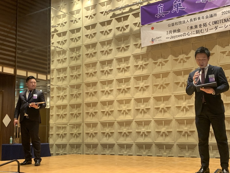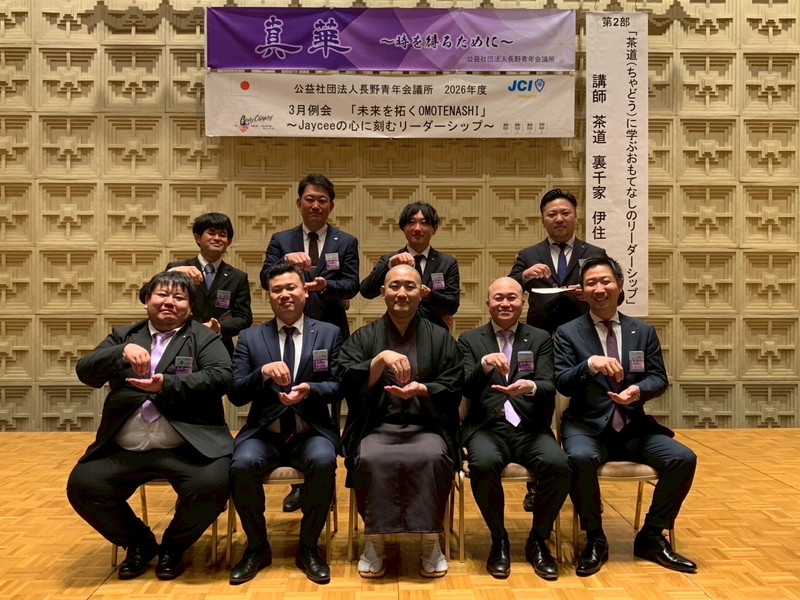 3月例会「未来を拓くOMOTENASHI~Jayceeの心に刻むリーダーシップ~」 開催報告 2026.04.08 Tweet Share リーダーに必要となる資質の理解と、それを育てる意欲の向上を目的とし、3月例会が開催されました。 例会では、「10通りのリーダーシップ」の紹介から始まり、裏千家 伊住宗陽様の「茶道に学ぶおもてなしのリーダーシップ」についての講演、そして最後に、「行動宣言」として、各メンバーが今年度の行動目標を考え、共有し合いました。 Tweet Share